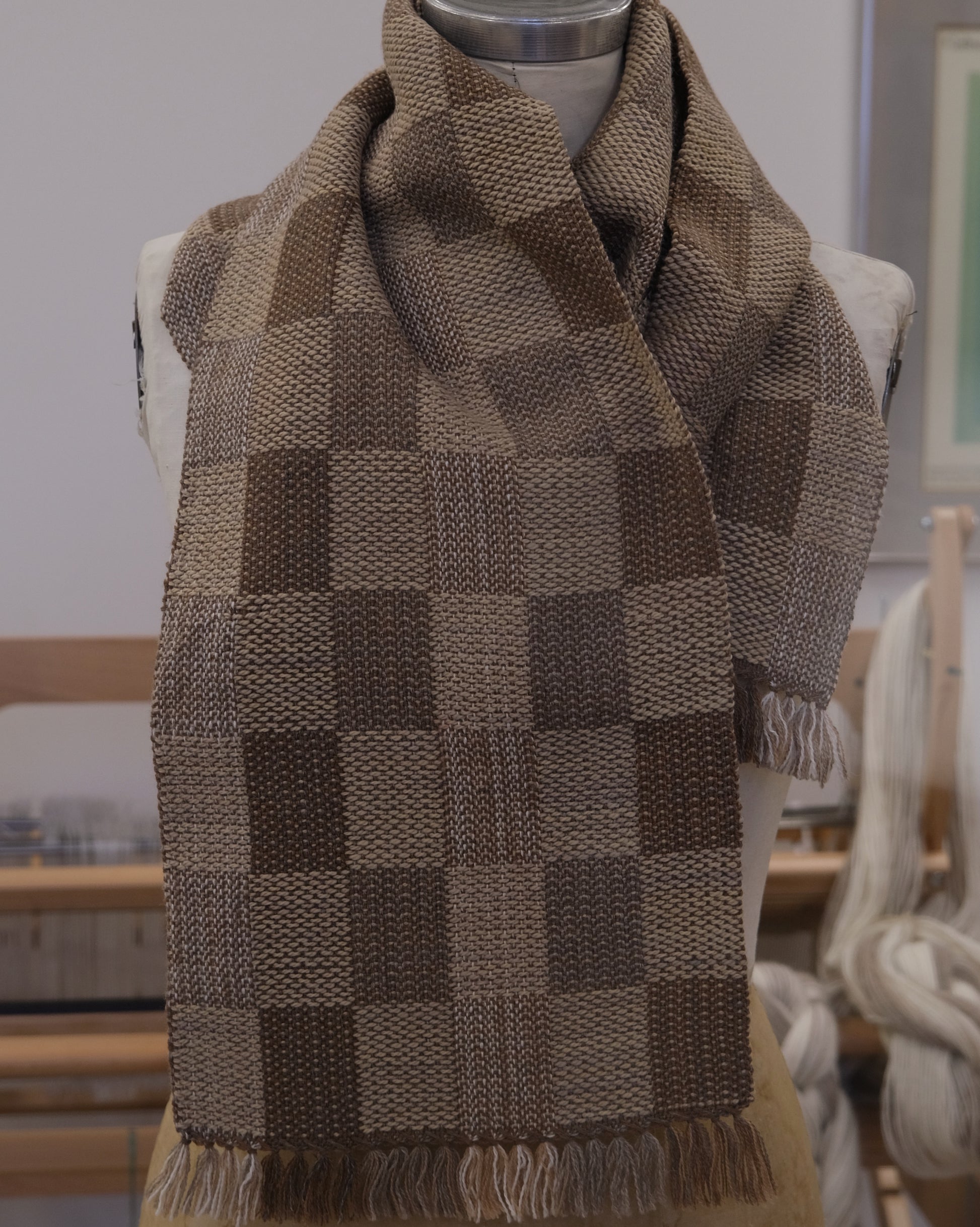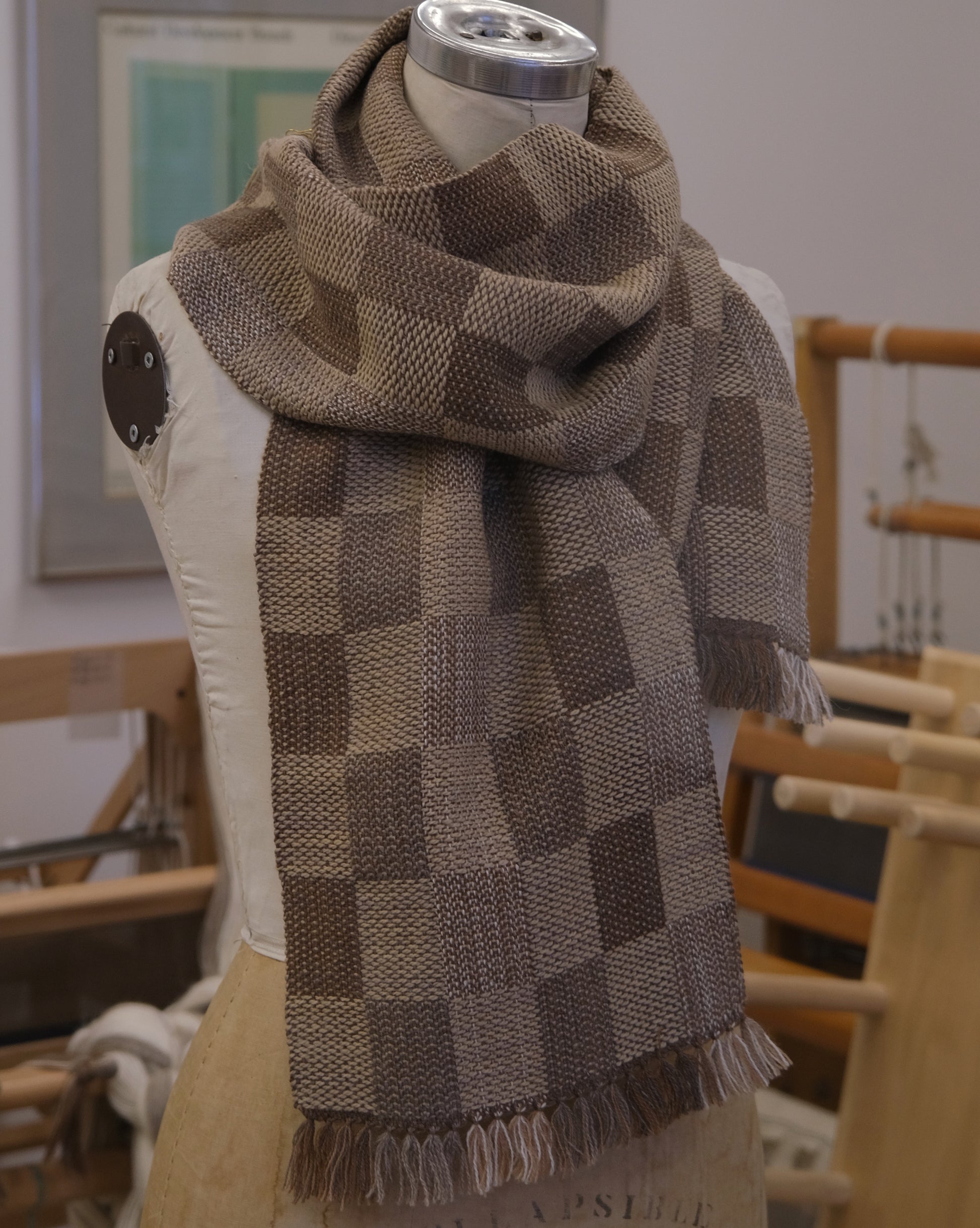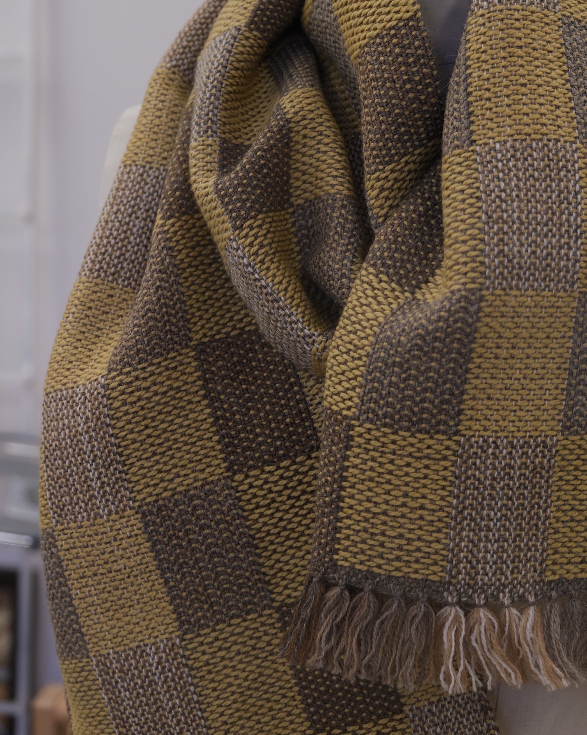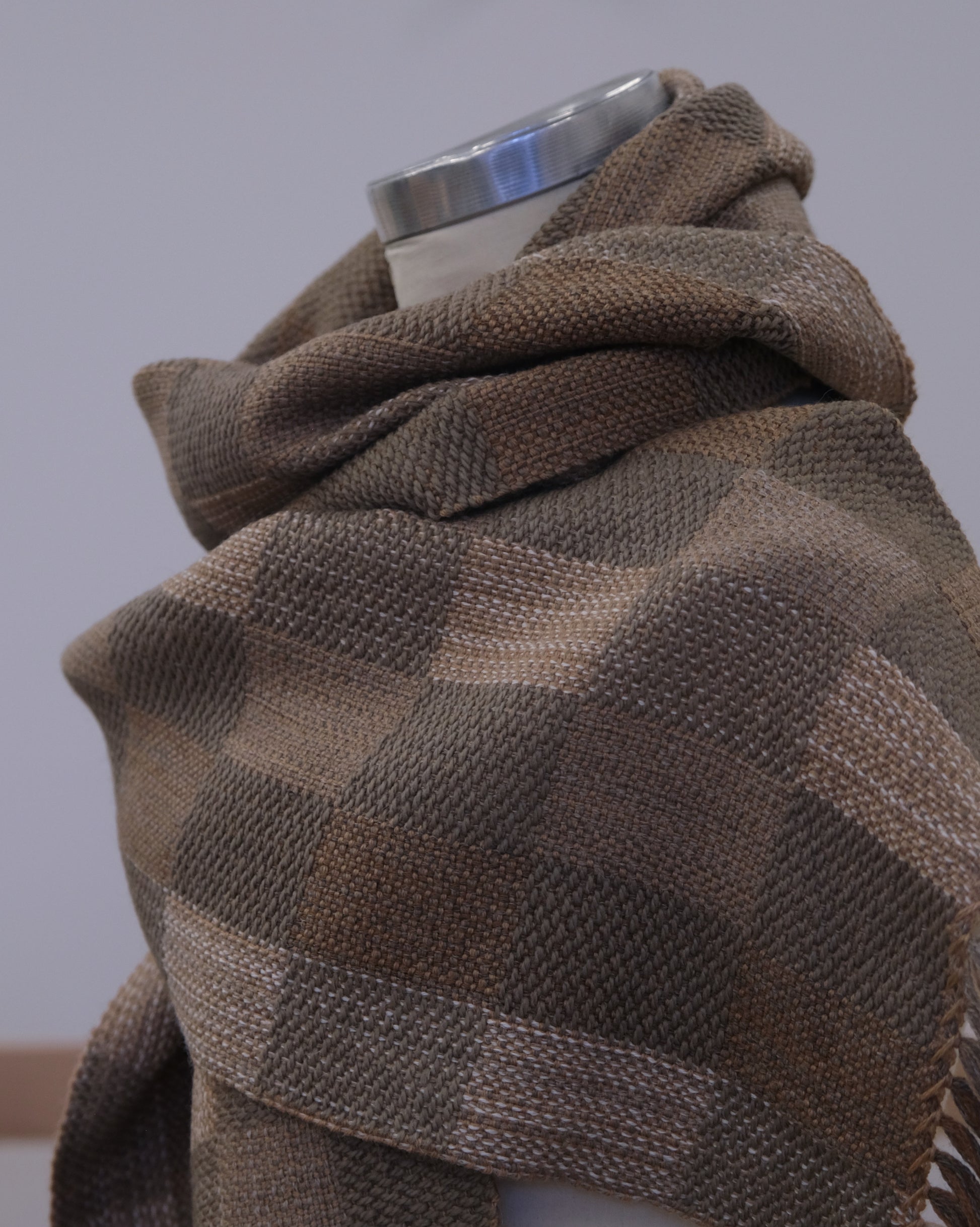 Chaîne de laine de mérinos et d'alpaga aux couleurs naturelles, trame de laine de mérinos teinte naturellement avec des plantes. Ce foulard est plutôt léger bien qu'il soit composé de laine à 100%. Il fera merveilleusement bien pour les entre saisons.